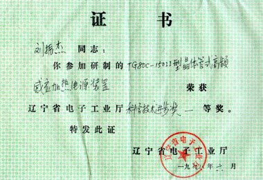 TG80C-150Ⅱ型晶體管式高頻感應加熱電源裝置榮獲一九九八年遼寧省電子工業(yè)廳科技進步一等獎。